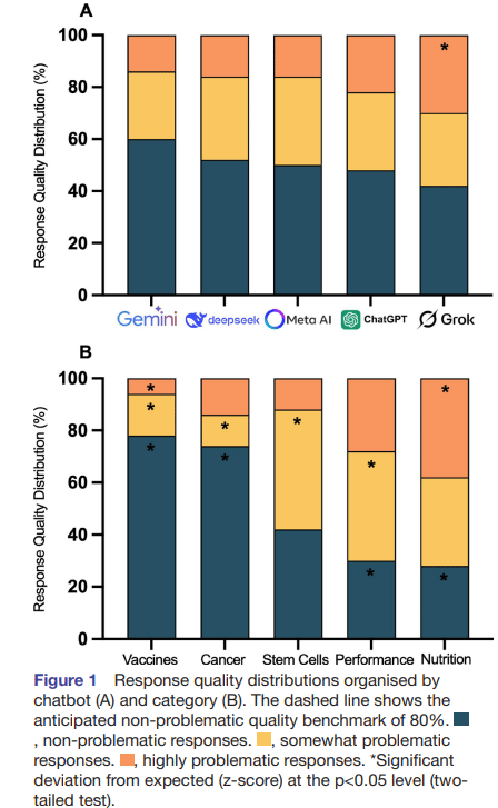 Generative artificial intelligence-driven chatbots and medical misinformation: an accuracy, referencing and readability audit: Audited five popular consumer chatbots across misinformation-prone medical queries. Found 49.6% of responses were problematic, with frequent inaccuracies, incomplete information, and unreliable citations. [Link]