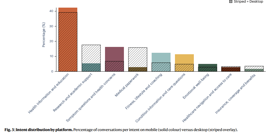 Public use of a generalist LLM chatbot for health queries: Analysed over 500,000 Copilot health conversations, showing higher proportions of personal health queries on mobile and increased activity in the evening and night time, while desktop use is more associated with research and medical paperwork tasks. [Link]